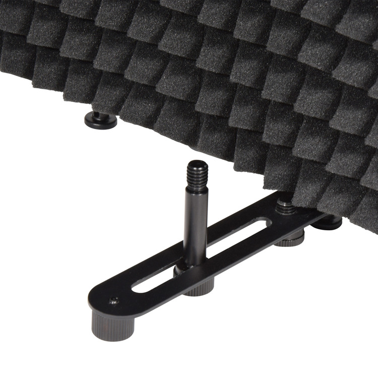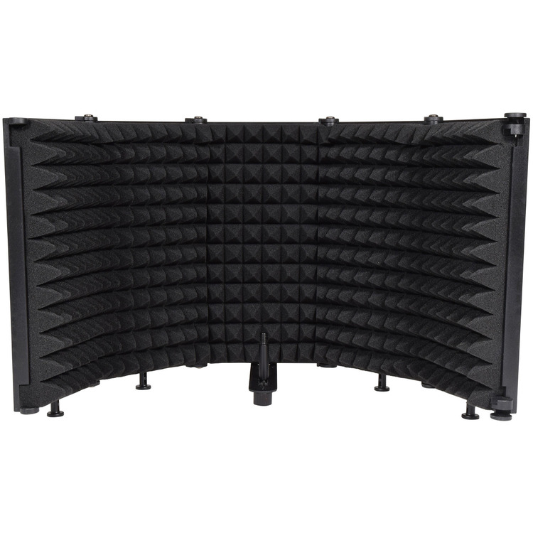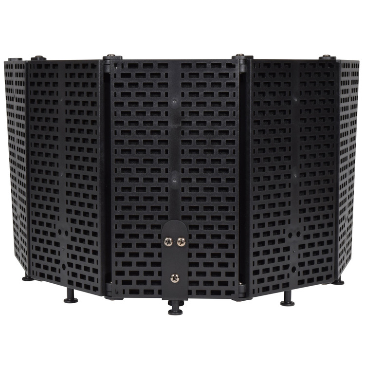 Foldable 5 section microphone isolation screen for recording vocal passages at close range without unwanted noise spill or room ambience. It is loaded with acoustic foam to absorb unwanted reflections and can be mounted onto a mic stand with standard 3/8" thread and adjusted to the necessary width.